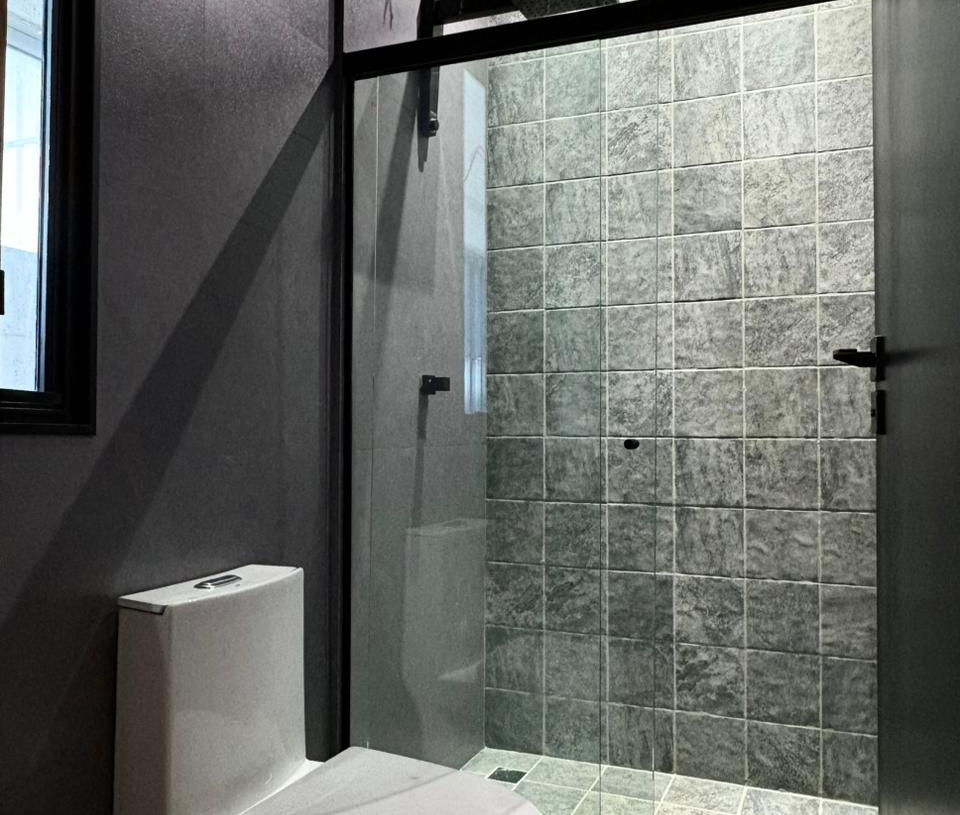 Banheiro completo: bancada e prateleira aérea de madeira pinus, torneira premium de alta vazão preta, cuba de sobrepor branca, vaso sanitário monobloco premium branco, chuveiro elétrico premium preto, espelho orgânico grande e box de esquadria Linha Suprema preto.
